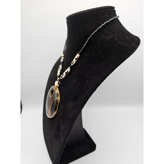 Vintage Amber Tigers Eye Style Pendant Necklace w/ Glass Beads Art to Wear