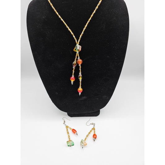 Vintage Glass Seed Bead Necklace and Earrings Set Gold Red Art to Wear