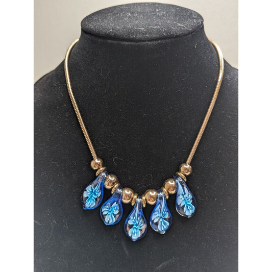 Vintage Glass Teardrop Style Beaded Necklace Floral Silver Tone