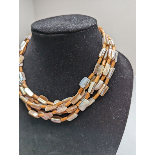 Vintage Multi Layered Beaded Necklace Beige Brown Mother of Pearl