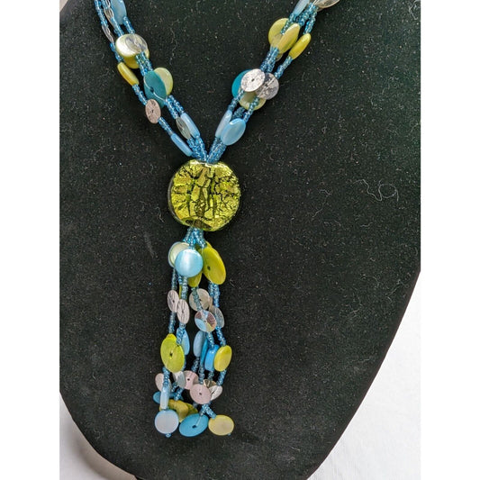 Vintage Multi Strand Disc Beaded Necklace Blue Green Mother of Pearl