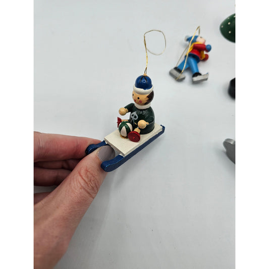 Lot of 5 Vintage Hand Painted Wooden Christas Ornaments Skis Tree Bell Metallic