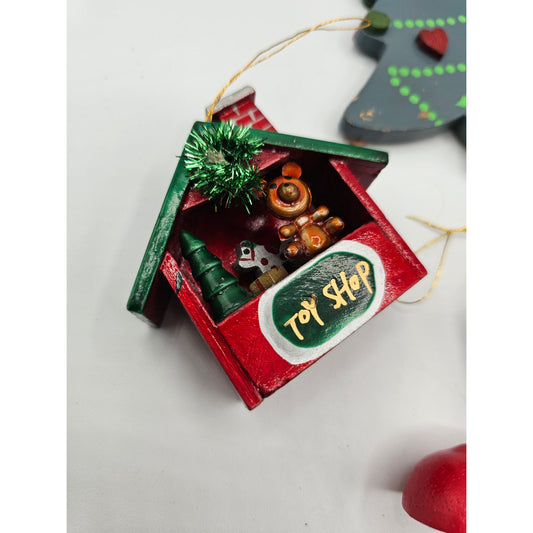 Lot of 5 Vintage Hand Painted Wooden Christas Ornaments Tree Toy Shop Angel