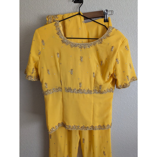 Vintage 1960s Indian Style Womens Skirt Pants Blouse Set Gold Embroidered