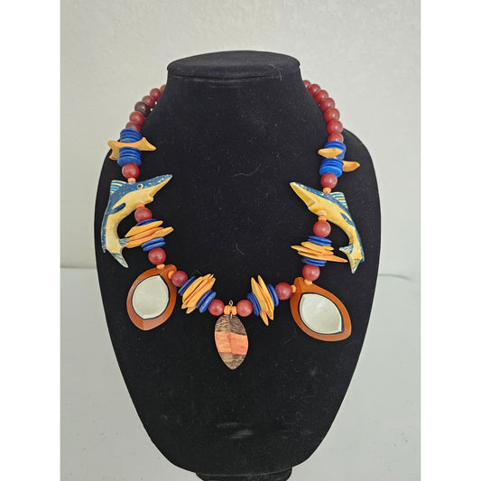 Vintage 1970s Large Wooden BEaded Estate Necklace Nautical Coconut and Fish