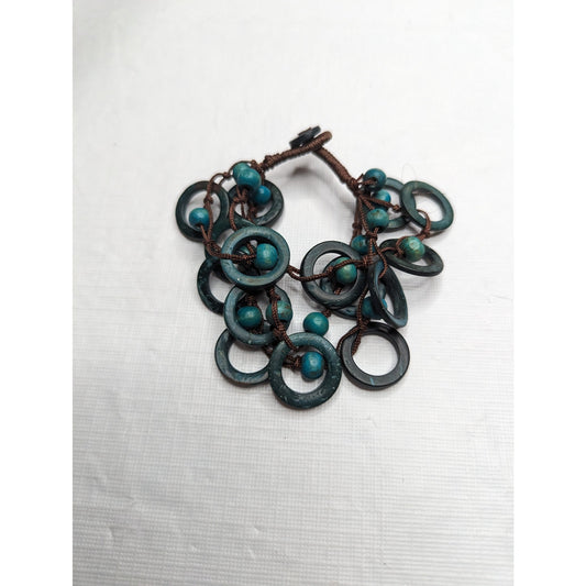 Vintage 1970s Teal Wooden BEaded Tiered Chunky Bracelet Brown String