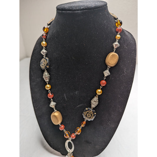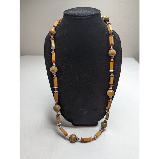 Vintage 1970s Single Strand Chunky Beaded Necklace Wood Multi Media Brown