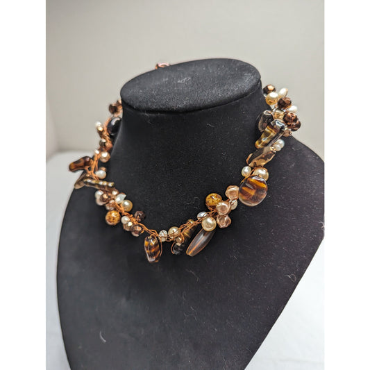 Vintage 1980s Choker Necklace Amber Color Beads Copper Wire String