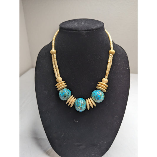 Vintage 1960s Chunky Beaded necklace Cream Tone and Blue Beads