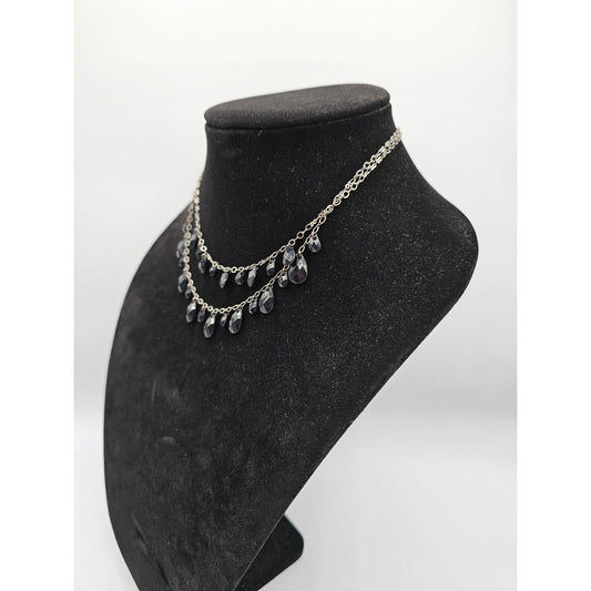 Vintage Y2K 2 Strand Beaded Chain Necklace Black Teardrop Rhinestones
