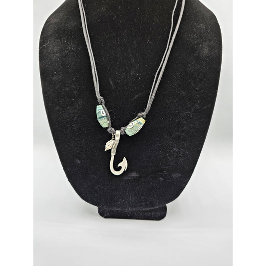 Vintage Y2K Rolled Rope Pendant Necklace Silver Tone Fish Hook Beaded Nautical