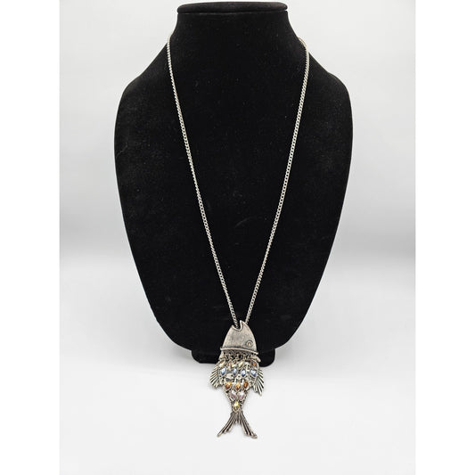 Vintage Fish Pendant Style Necklace Silver Tone Chain Inlay Stones