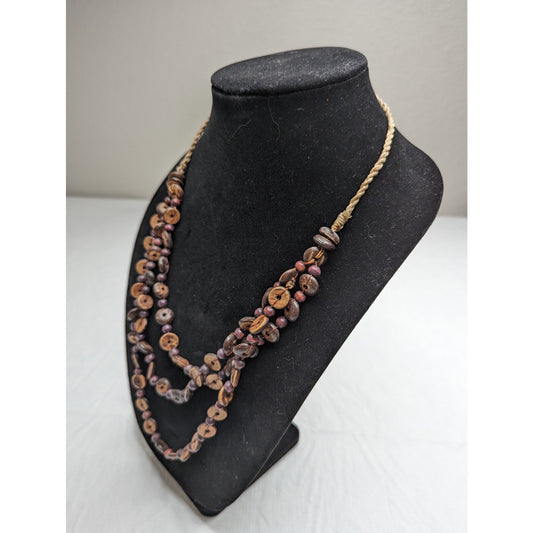 Vintage 1970s Hemp Rope Wooden Bead Layered Necklace Brown