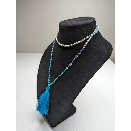 Vintage Turquoise Blue Tassel Single Strand Glass Beaded Boho Necklace