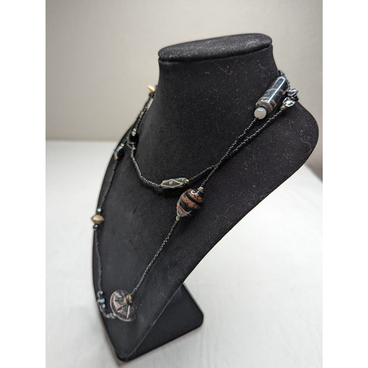 Vintage Silver Tone Long Strand Necklace Dainty Black Stone Accents