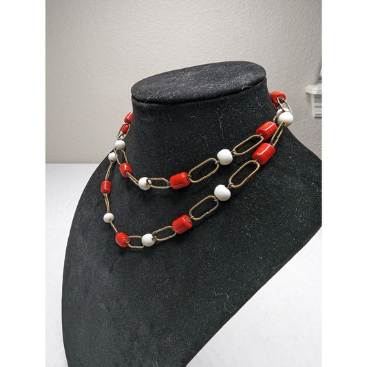 Vintage 1970s Womens Beaded Chain Necklace Red White Gold Mod