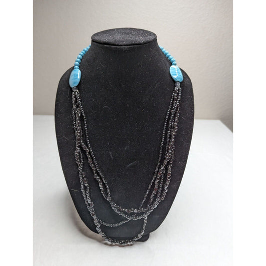 Vintage Turquoise and Black Beaded Stone Long Layered Necklace Southwestern