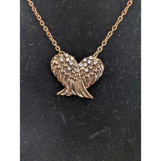 Womens Gold Tone Heart Shaped Wings Necklace w/ Rhinestones New