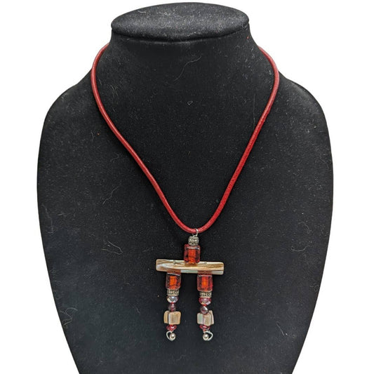 Vintage Rolled Rope Style Red and Beige Glass Pendant Necklace