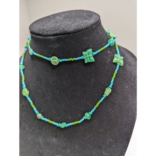 Vintage Y2K Single Strand Glass Beaded Necklace Green Blue Butterfly Beads