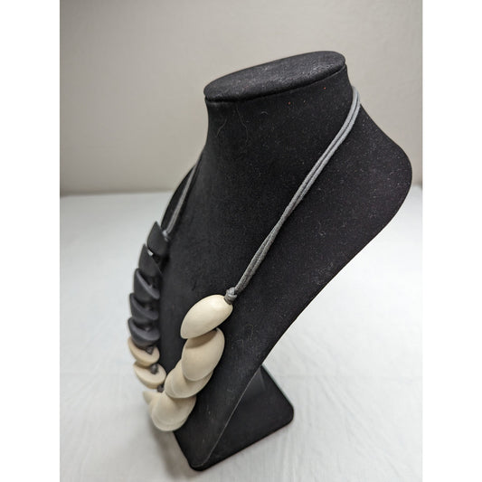Vintage Wooden Shell Style Leather Rope Beaded Necklace Gray Ivory