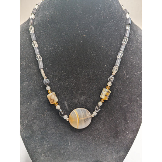 Vintage Glass Beaded Single Strand Necklace w/ Disk Stone Center Black White
