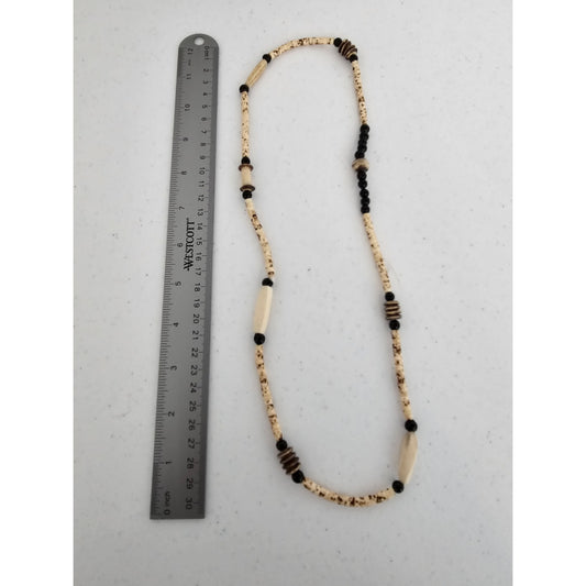 Vintage Mid Century Wooden Beaded Single Strand Necklace Beige Black Mod