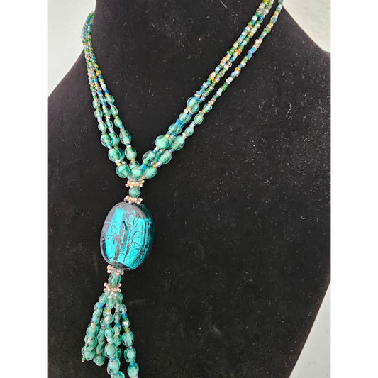 Vintage Mid century Teal Glass Beaded Necklace Southwestern Style Tassel