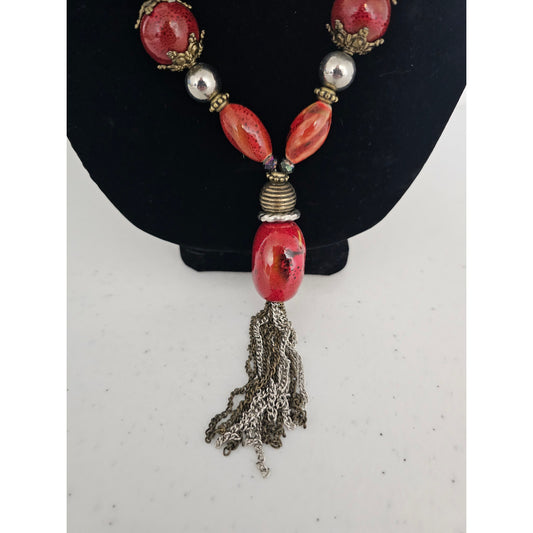 Vintage 1970s Chunky Single Strand Necklace w/ Tassel Coral Silver