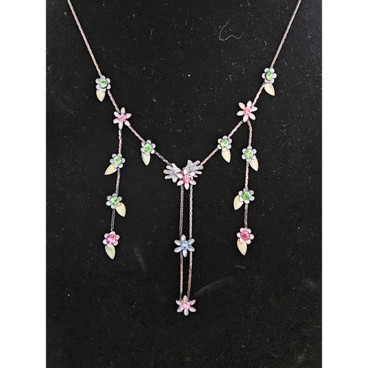 Vintage Y2K Dainty Waterfall Necklace Silver Tone Colorful Rhinestone Flowers