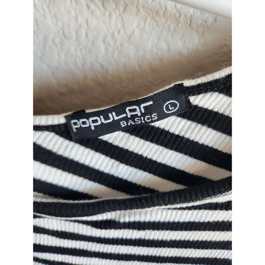 Popular Basics Womens Sz L Ribbed Mini Dress Wide Shoulder Black White Striped Y