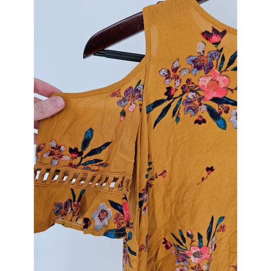 Xhilaration Womens Sz S Knee Length Cold Shoulder Boho Dress Mustard Yellow