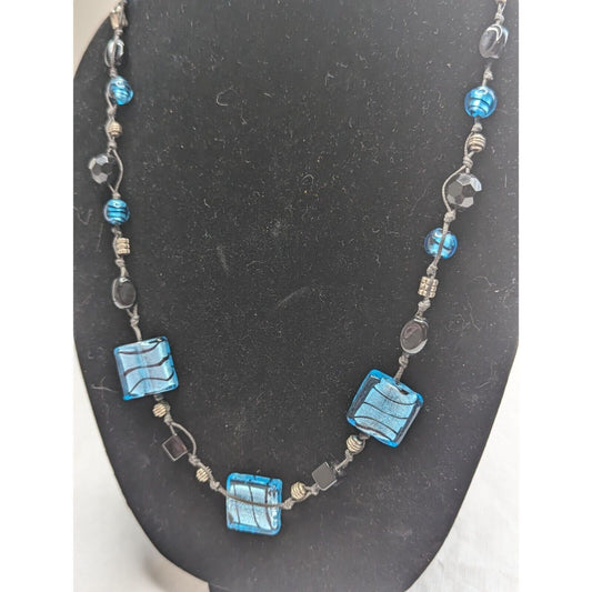 Vintage Blue and Black Glass Art Deco Beaded Necklace 1970s
