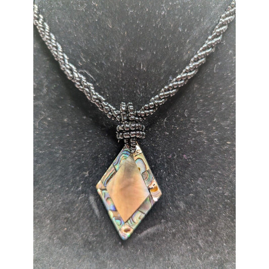 Vintage Onyx Black Beaded Rope Necklace w Mother of Pearl Pendant Southwestern