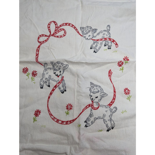 Vintage 1950s Baby Crib Blanket Cotton Embroidered Doe Deer Flowers Ribbon