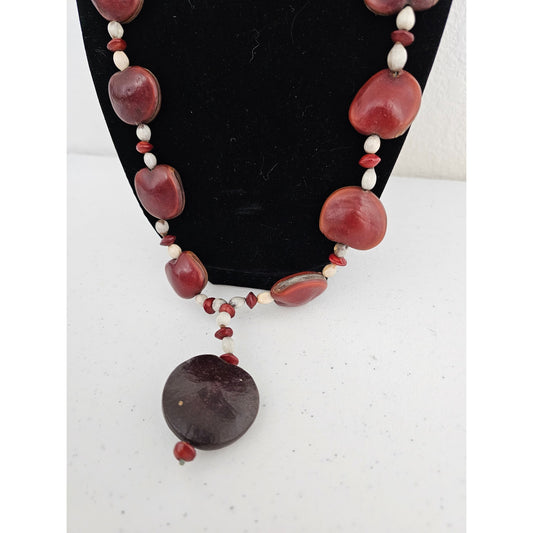 Vintage Mid Century Dark Red Shell Chunky Beaded Necklace Primitive