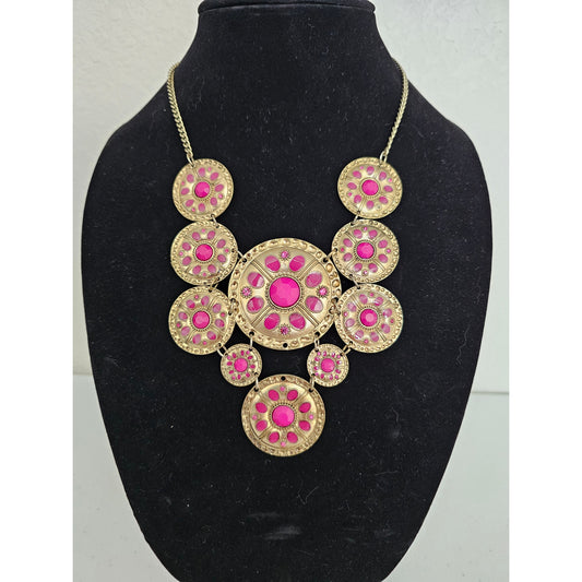 Vinatge Mid Century Medallion Bib Style Necklace Gold and Pink