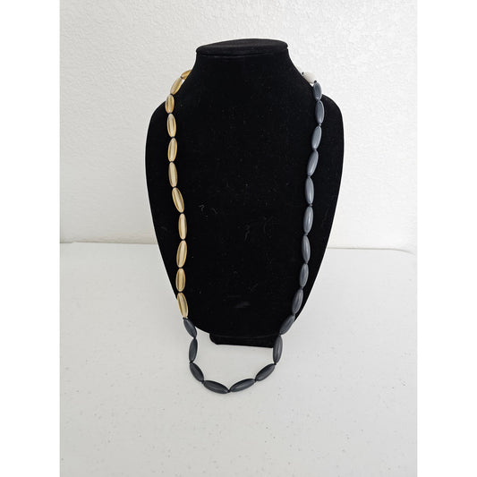 Vintage 1990s Single Strand Oval Beaded Necklace Black Beige White