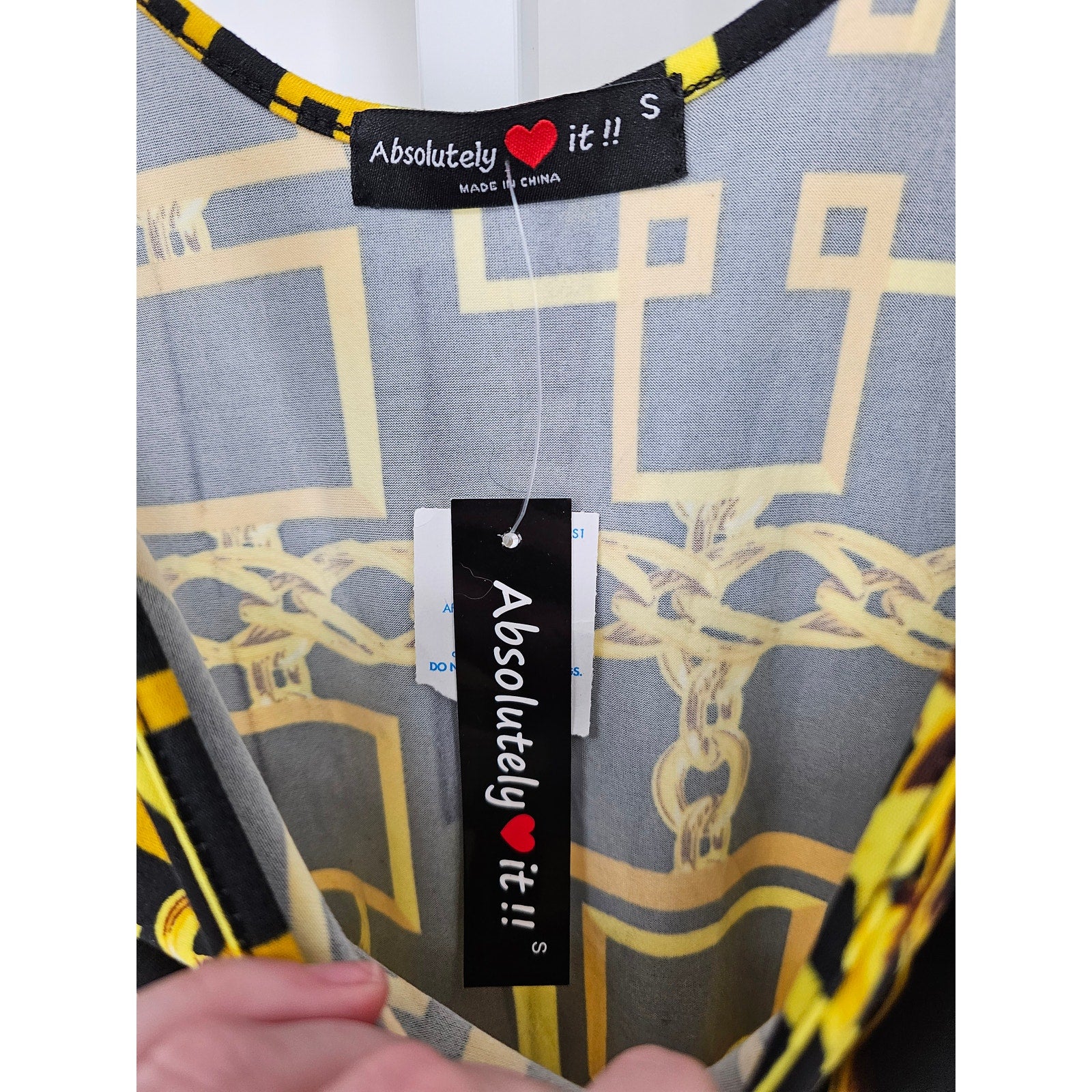 Absolutely It Womens Sz S Knee Length Fitted Dress Black Gold Chain Print