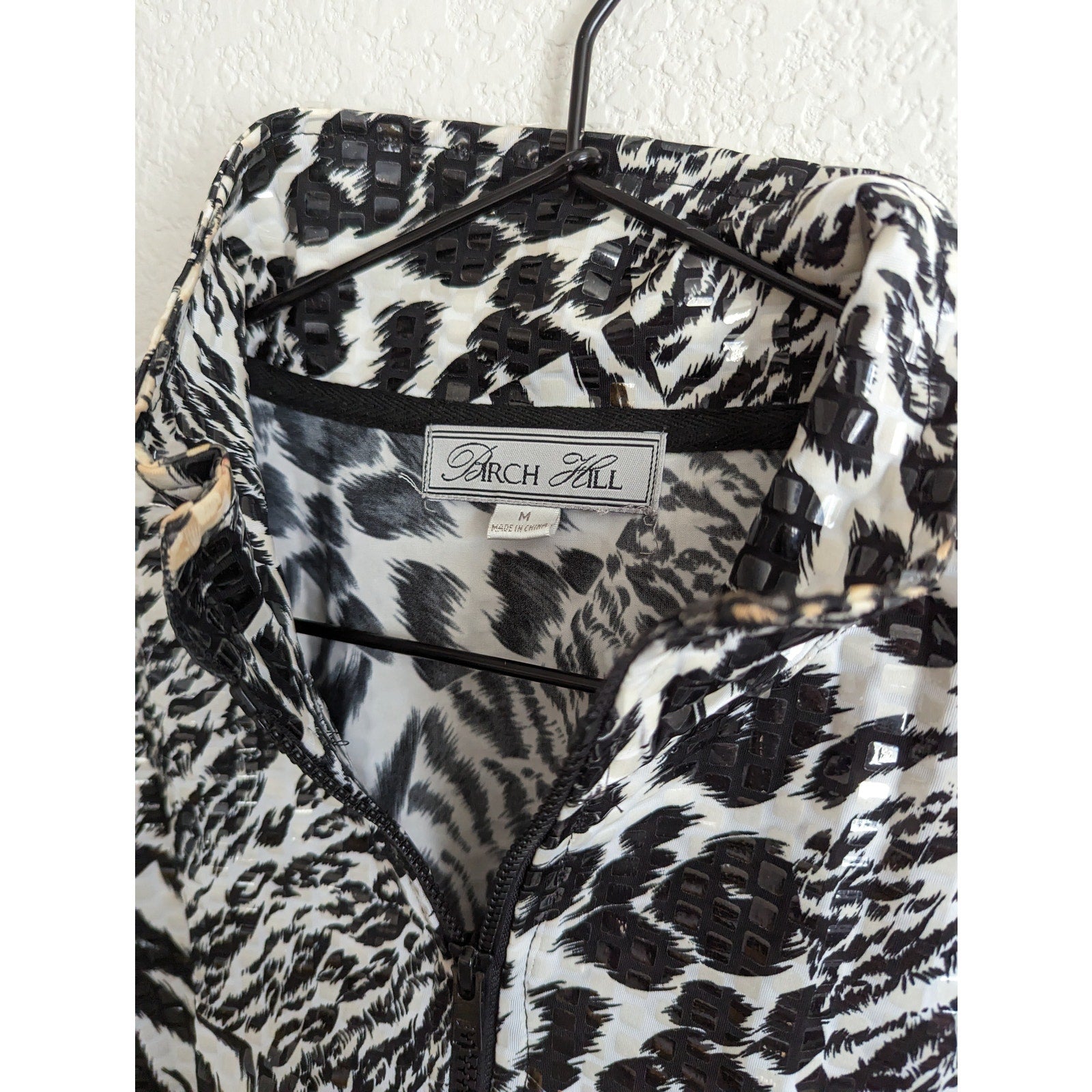 This Birch Hill jacket from the 90's Y2K era is a stylish addition to any wardrobe. With a black and white color scheme and bling detailing, it's sure to catch the eye. The zip-up track style provides a comfortable fit for women's size M. Whether you're looking to add to your collection of vintage clothing or just want a unique piece to wear out, this jacket is a great choice.