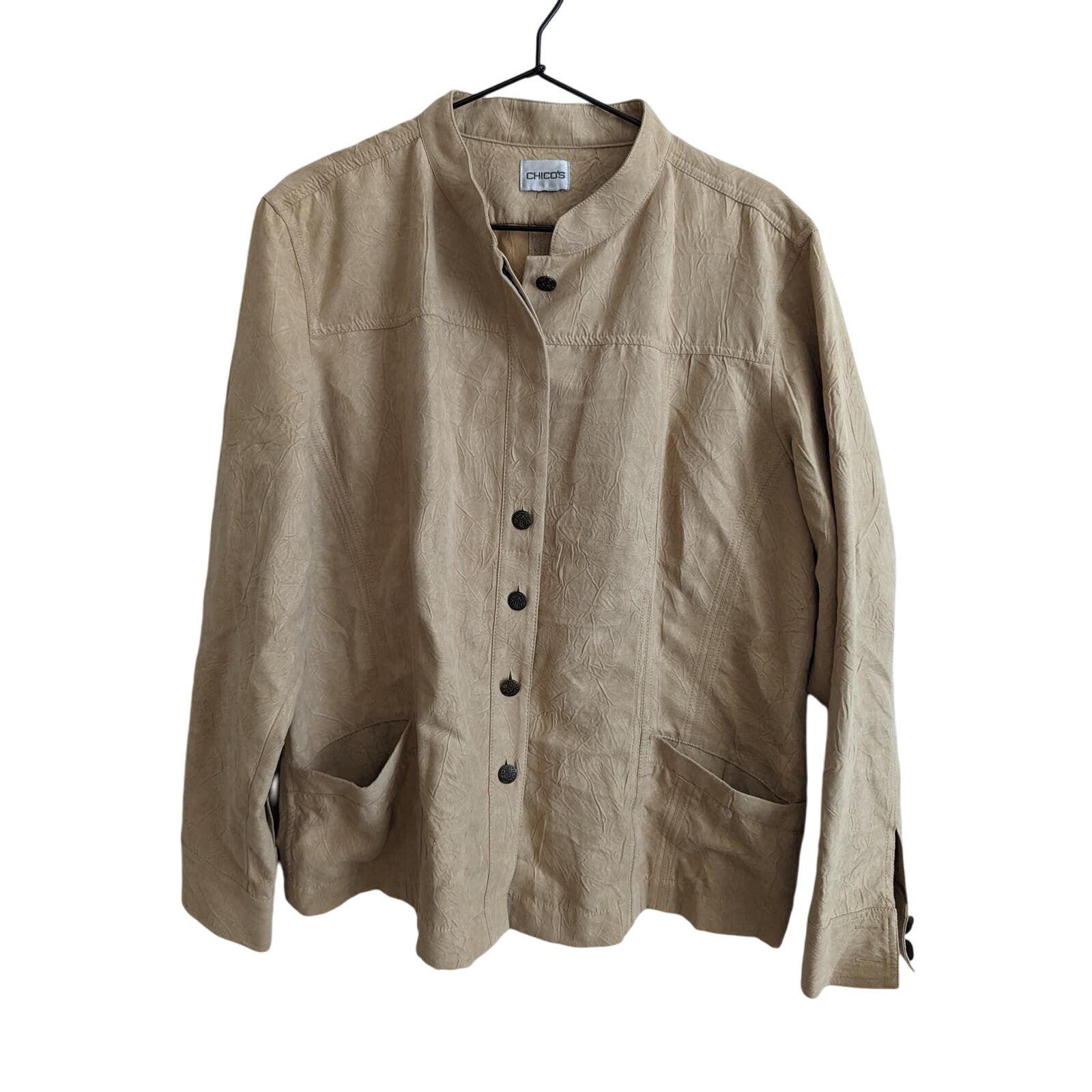 This Chicos Women's Button Front Jacket is a stylish and comfortable piece of clothing that you'll love to wear. The jacket is made of suede and is lightweight, making it perfect for any season. The beige color is versatile and goes well with many different outfits. The jacket is a size 2 (2XL), and features a button front.