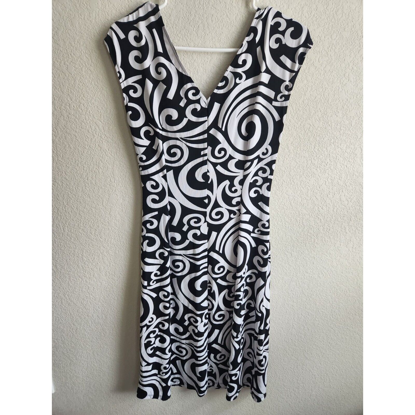 London Style Womens Sz 10 Midi Dress Black White Swirl Print V Neck