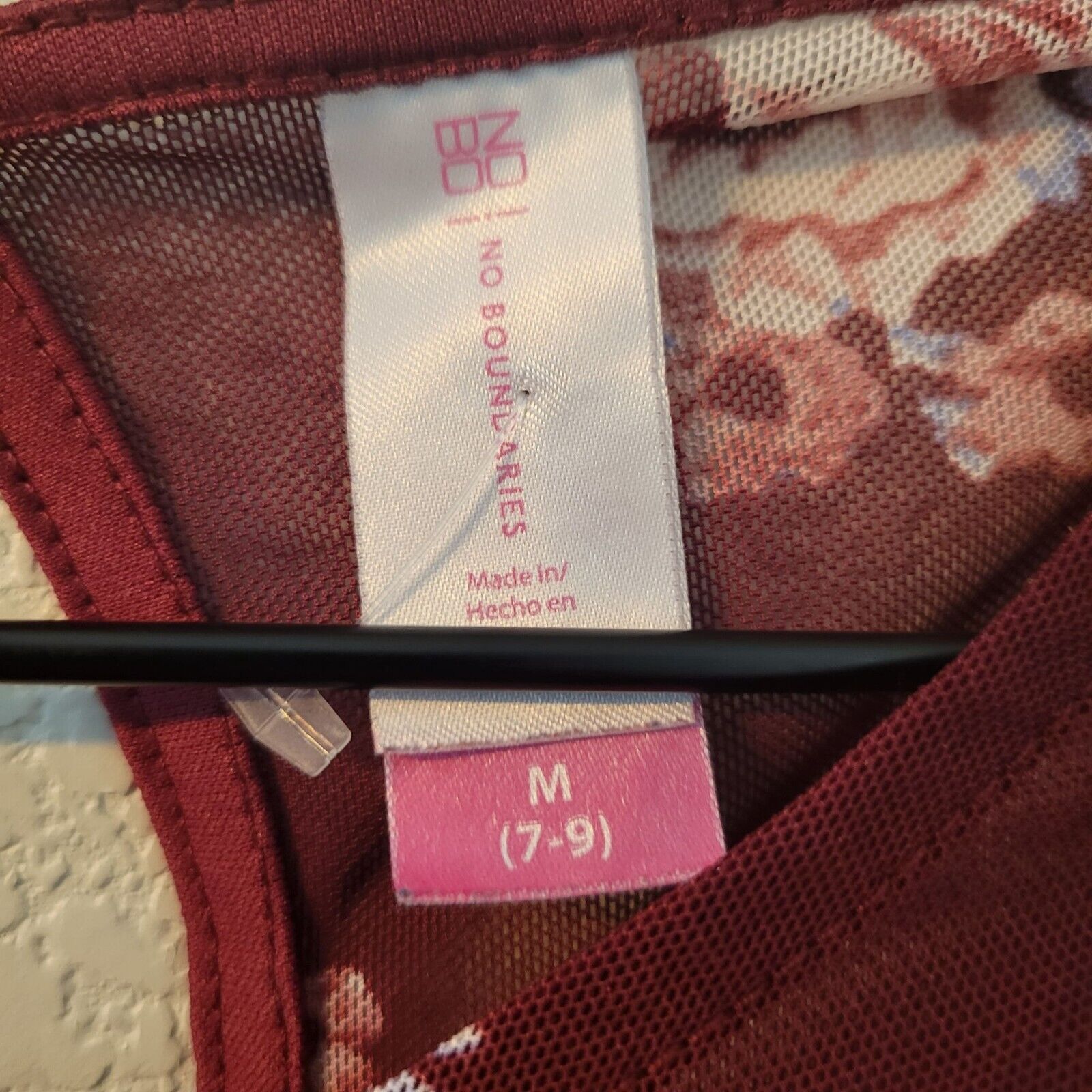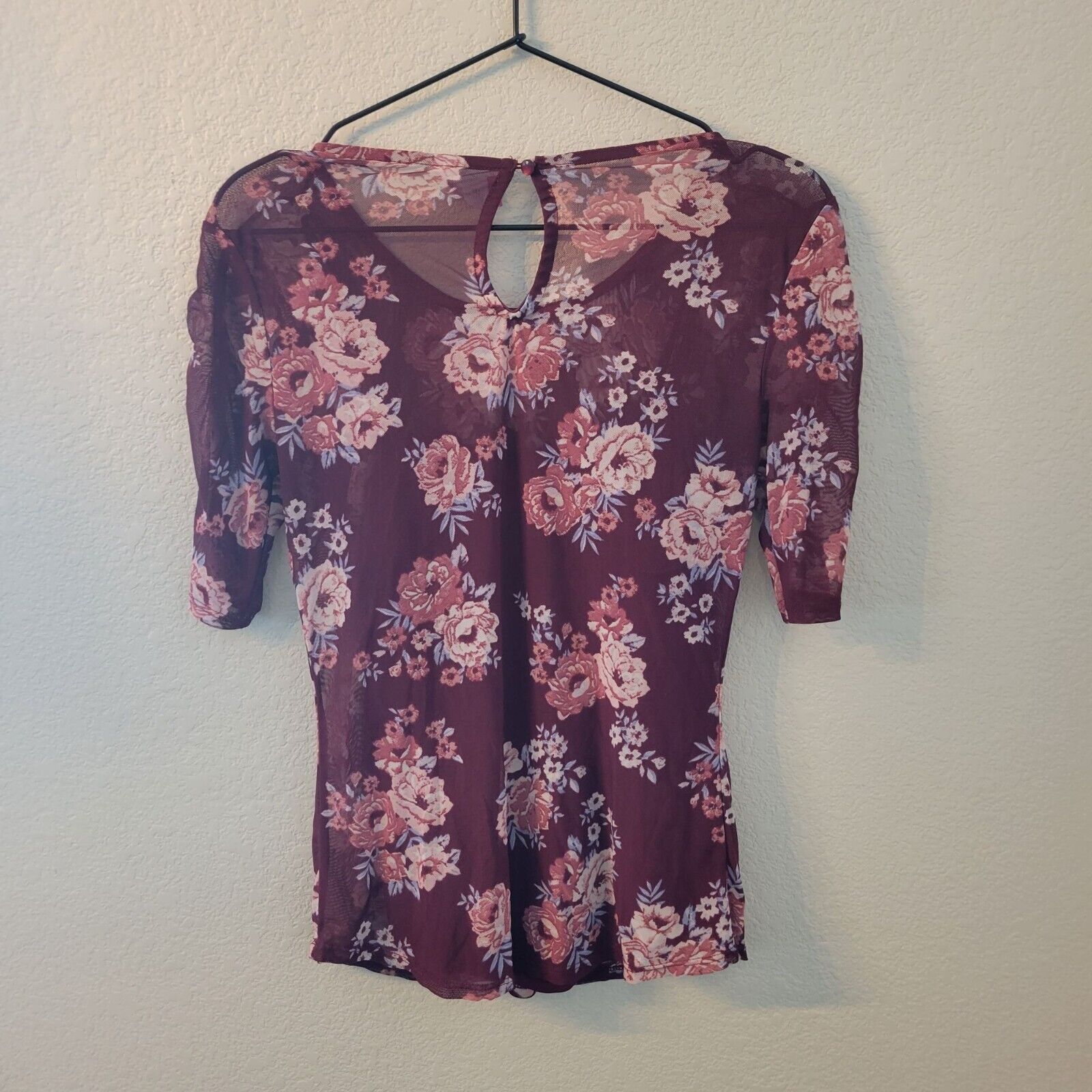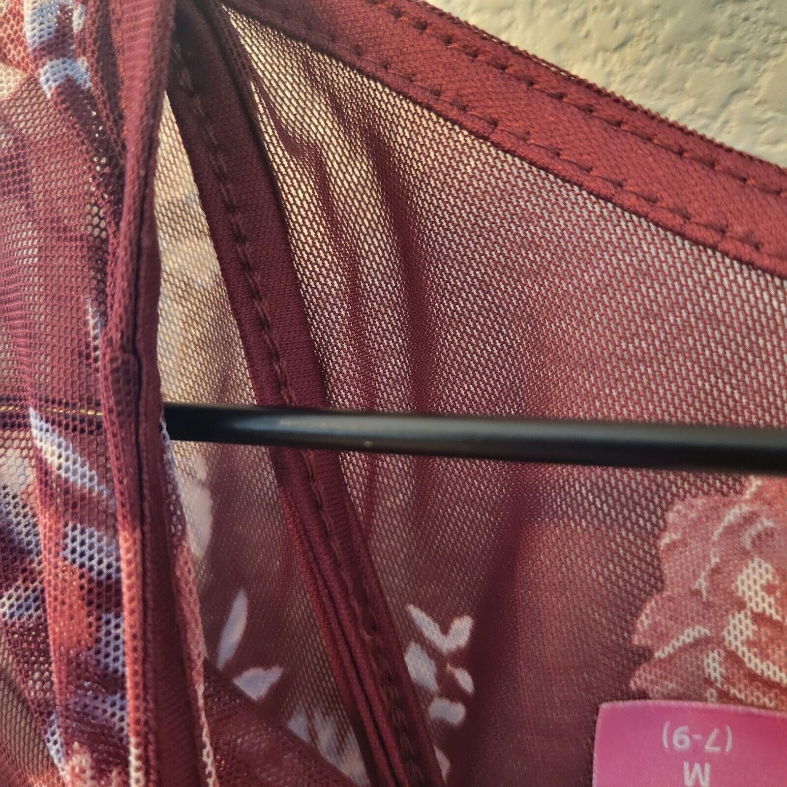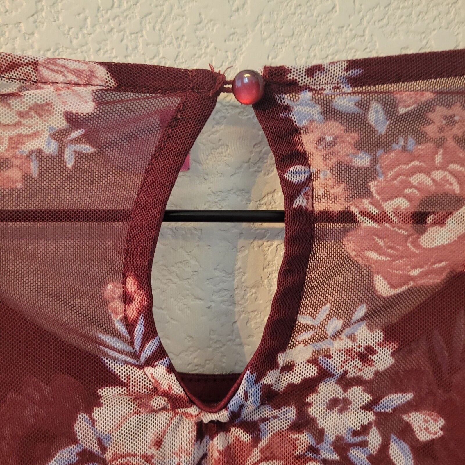 No Boundaries Juniors Sz M Short Sleeve Blouse Dark Red Floral Mesh