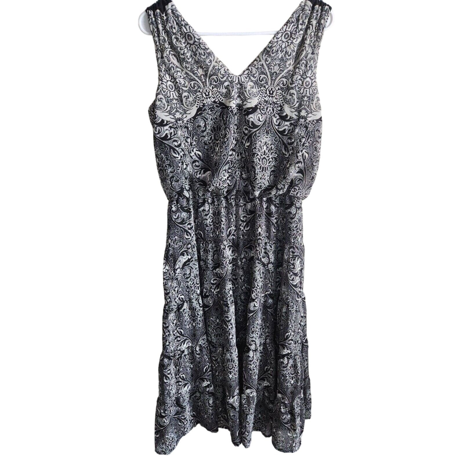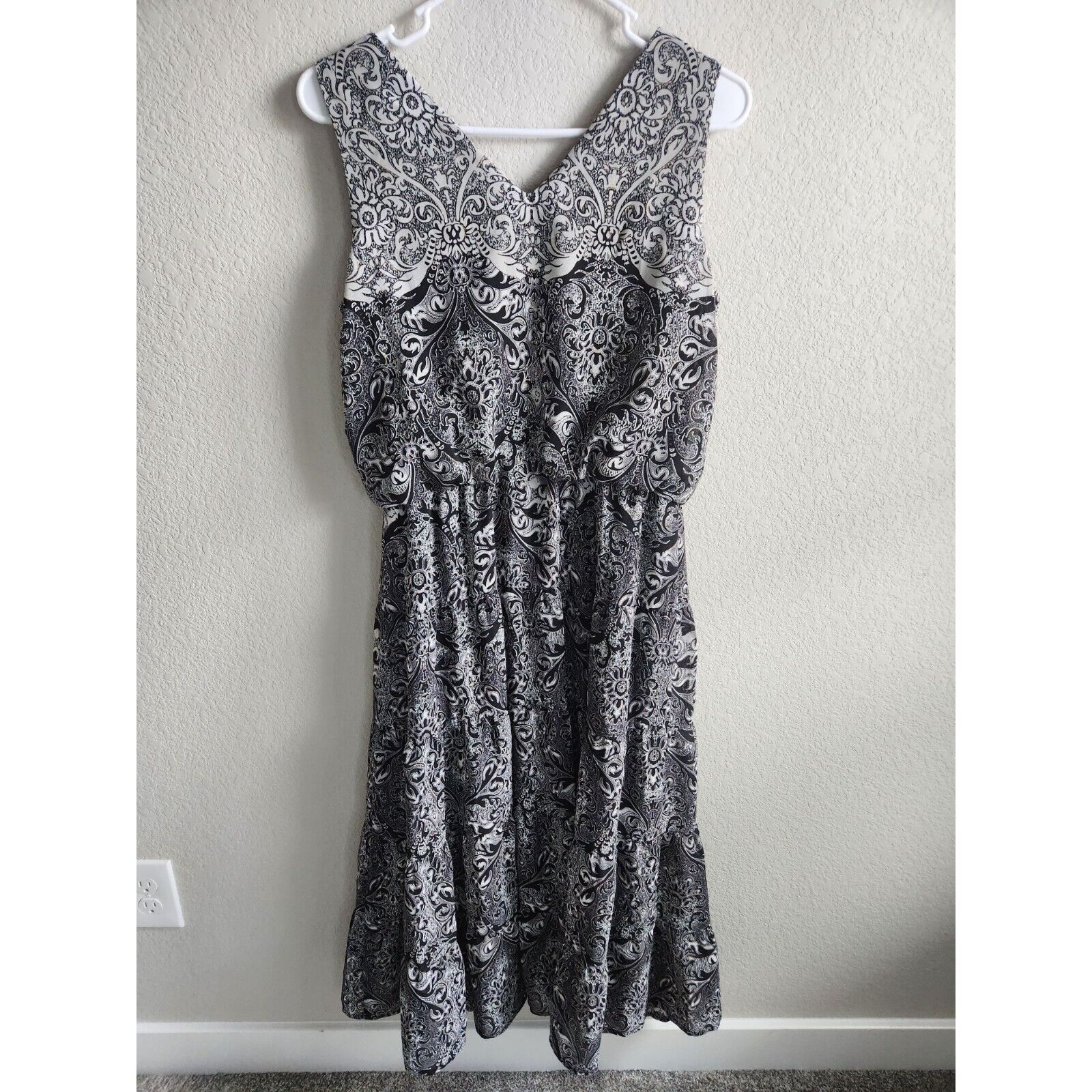 Perceptions Womens Sz 10P Petite Midi Dress Black White Print Sleeveless