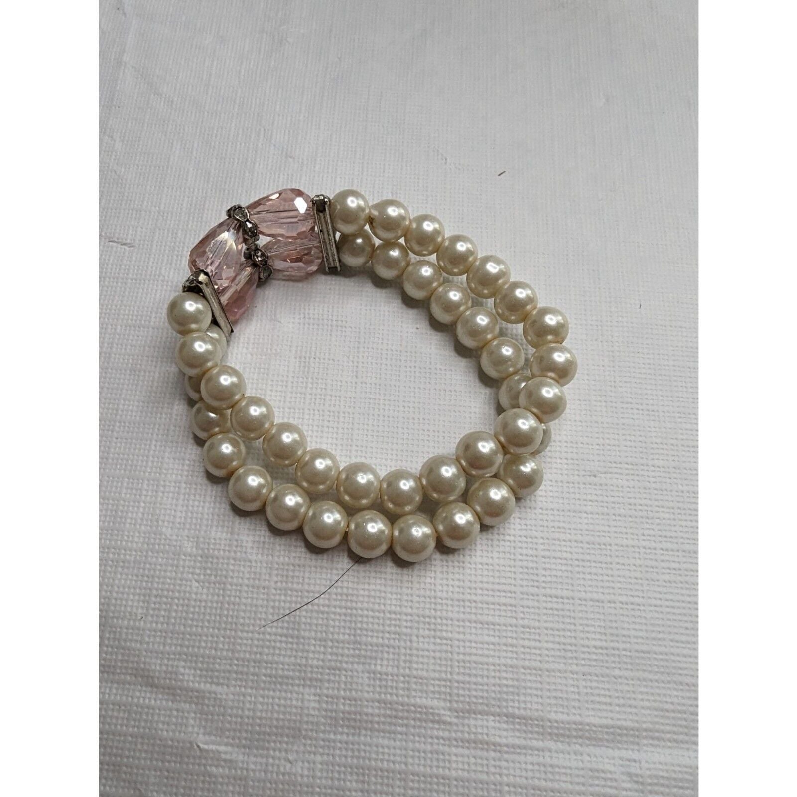 Vintage 1990s 2 Strand Beaded Bracelet Faux Pearl and Pink Stones