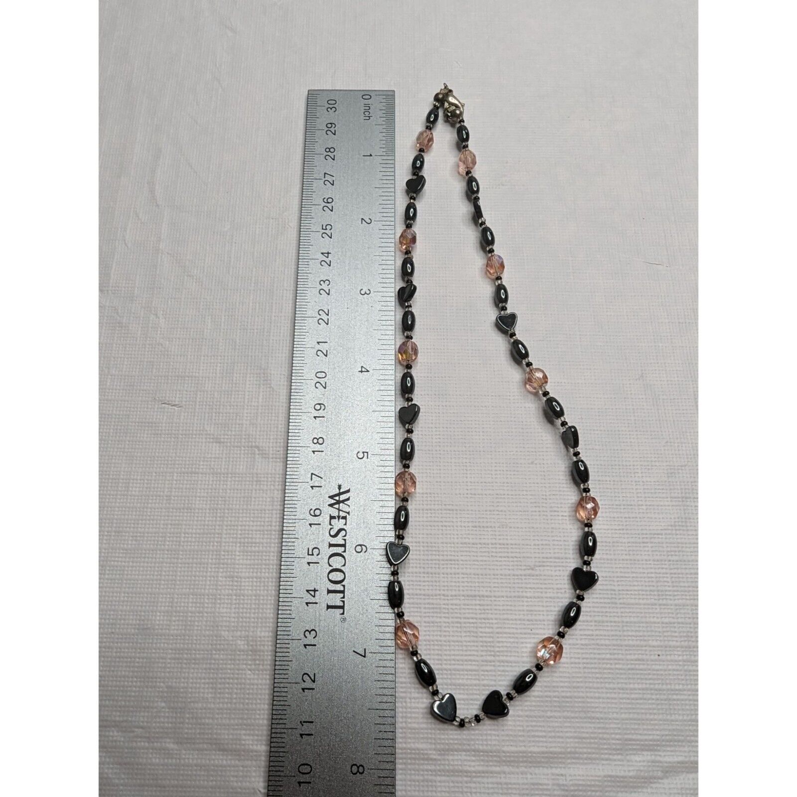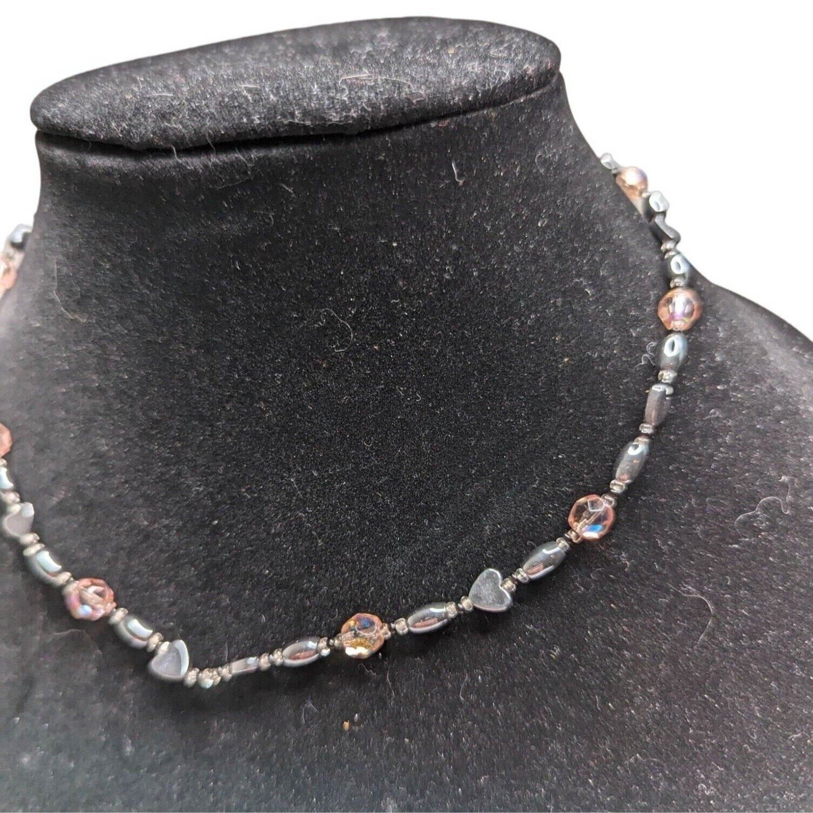 Vintage Y2K Womens Beaded Choker Necklace Pink Beads Silver Hearts