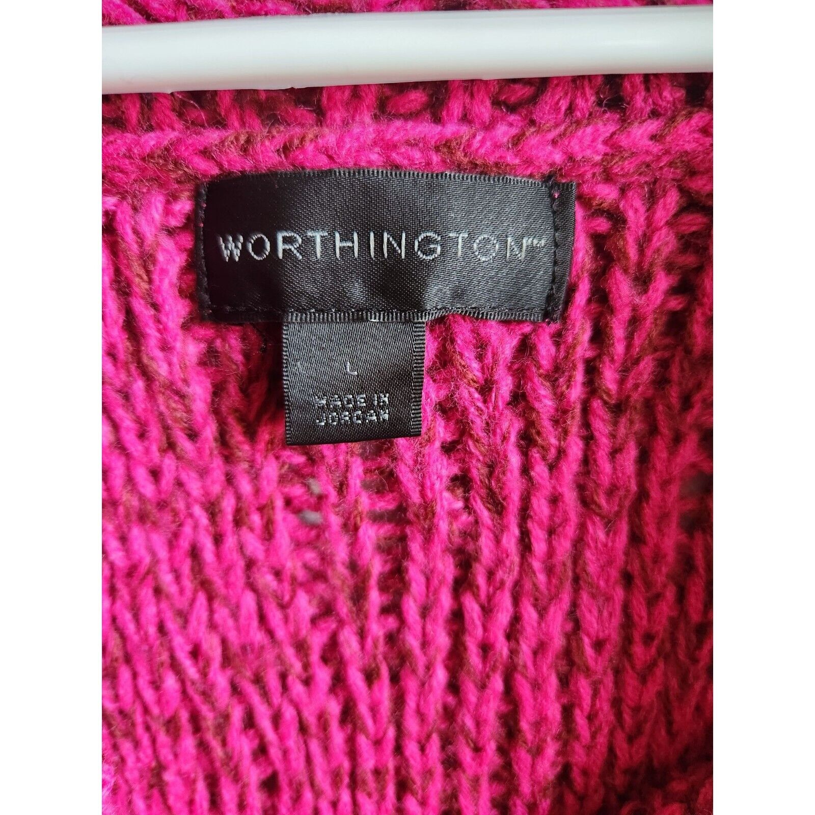 This Worthington sweater dress is perfect for any occasion. With its bright pink color and cowl neck, it is sure to make a statement. The dress is a size L and hits above the knee, making it a flattering choice for any body type. Whether you're going out with friends or to a formal event, this dress will have you looking stylish and confident. Make it your own by pairing it with your favorite accessories and shoes.