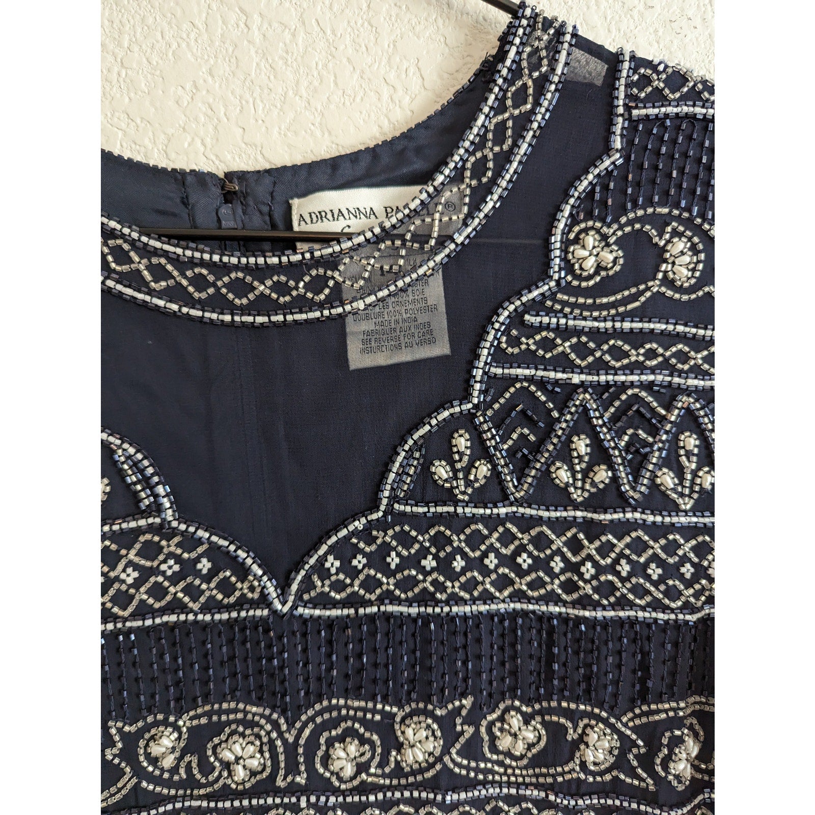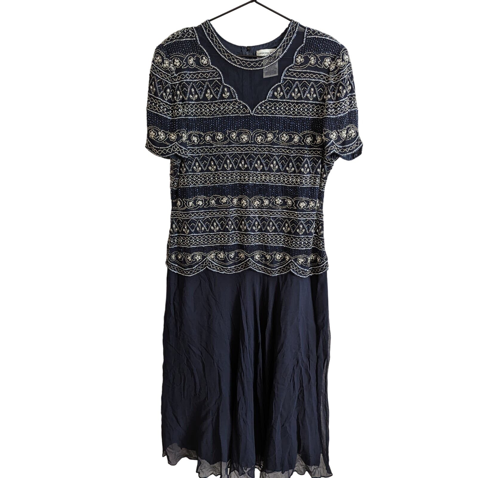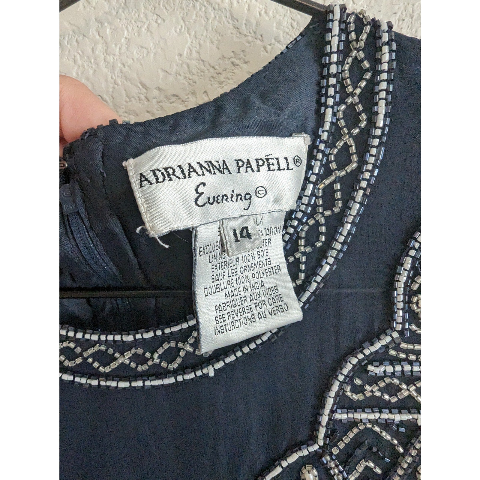 Adrianna Papell Evening 100% Silk Navy Blue Mother of the Bride Dress Beaded