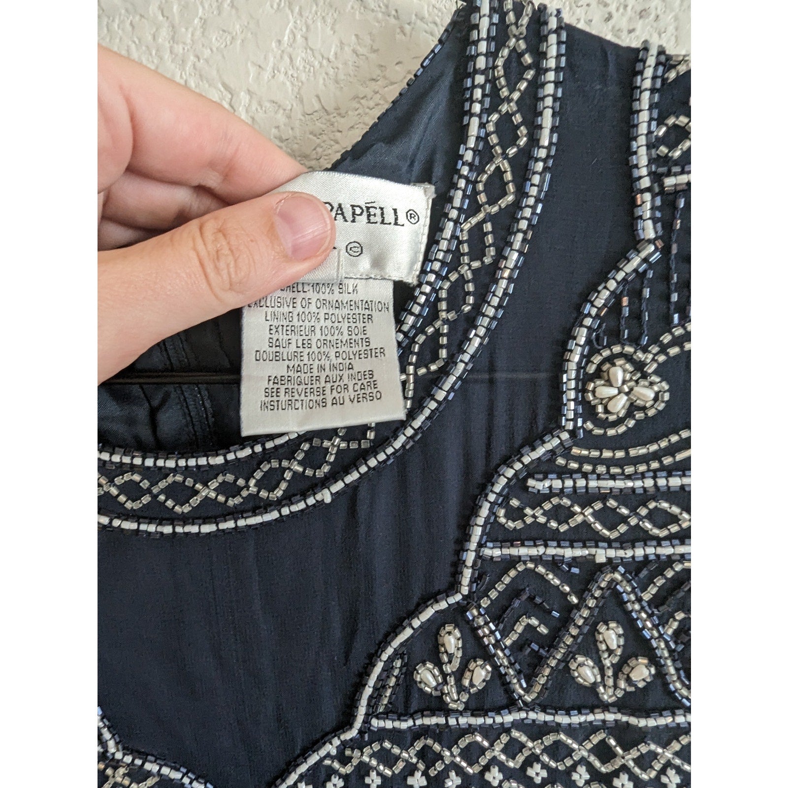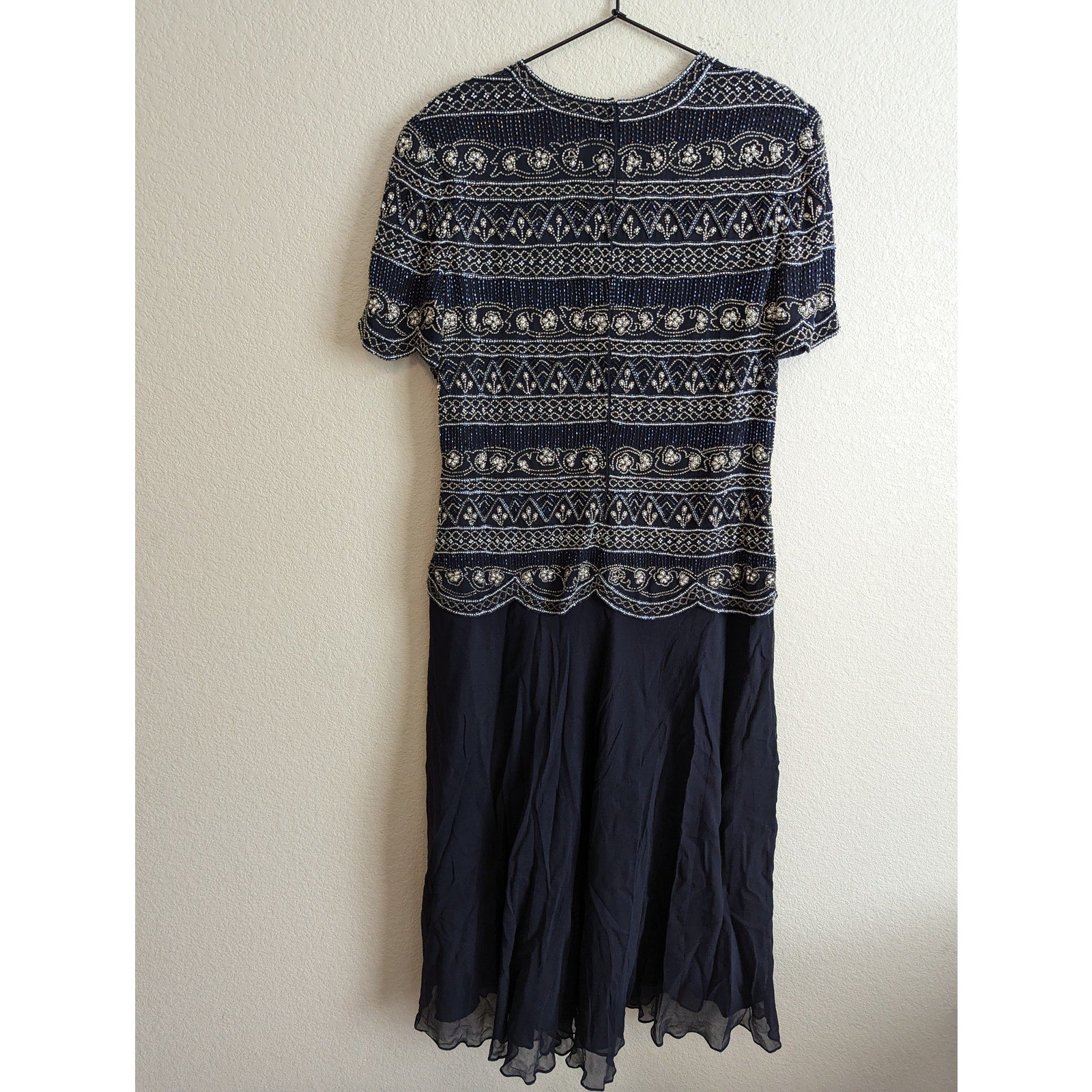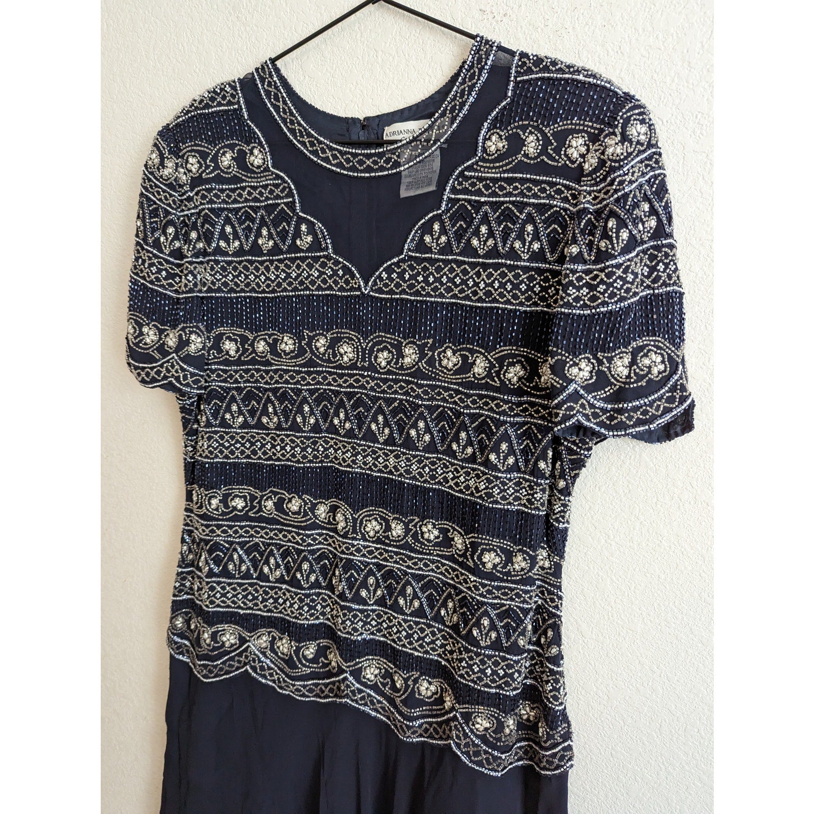Adrianna Papell Evening 100% Silk Navy Blue Mother of the Bride Dress Beaded