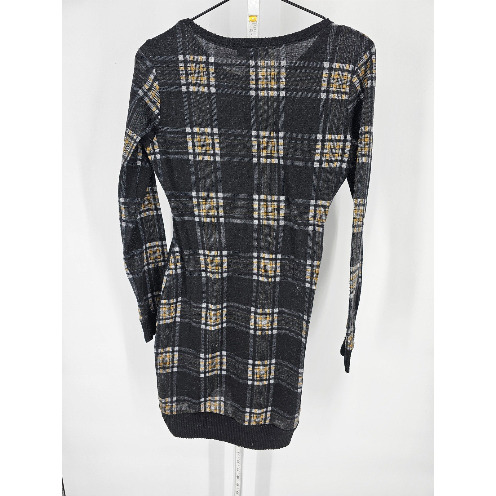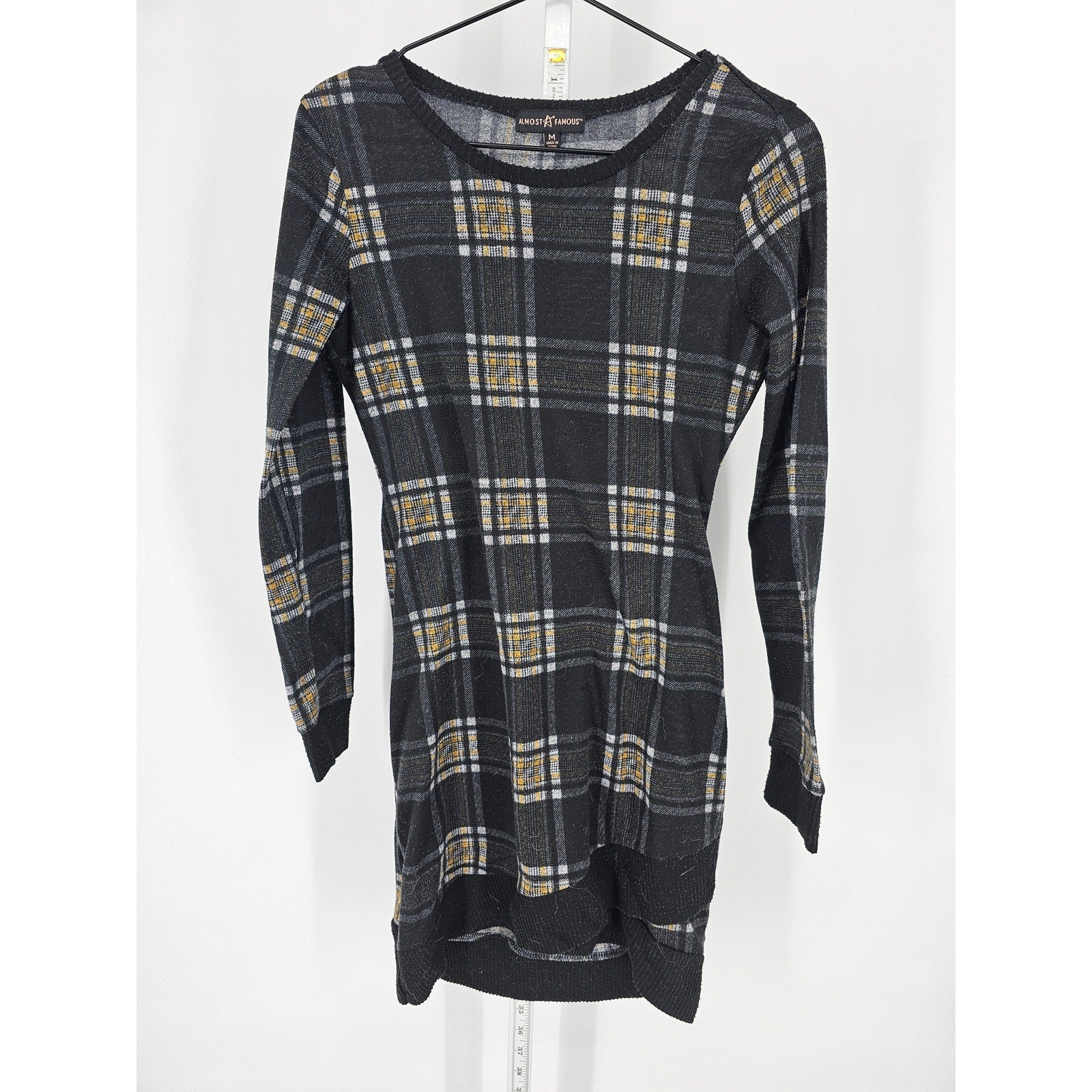 Almost Famous Womens M Knee Length Long Sleeve Fitted Dress Black Yellow Plaid